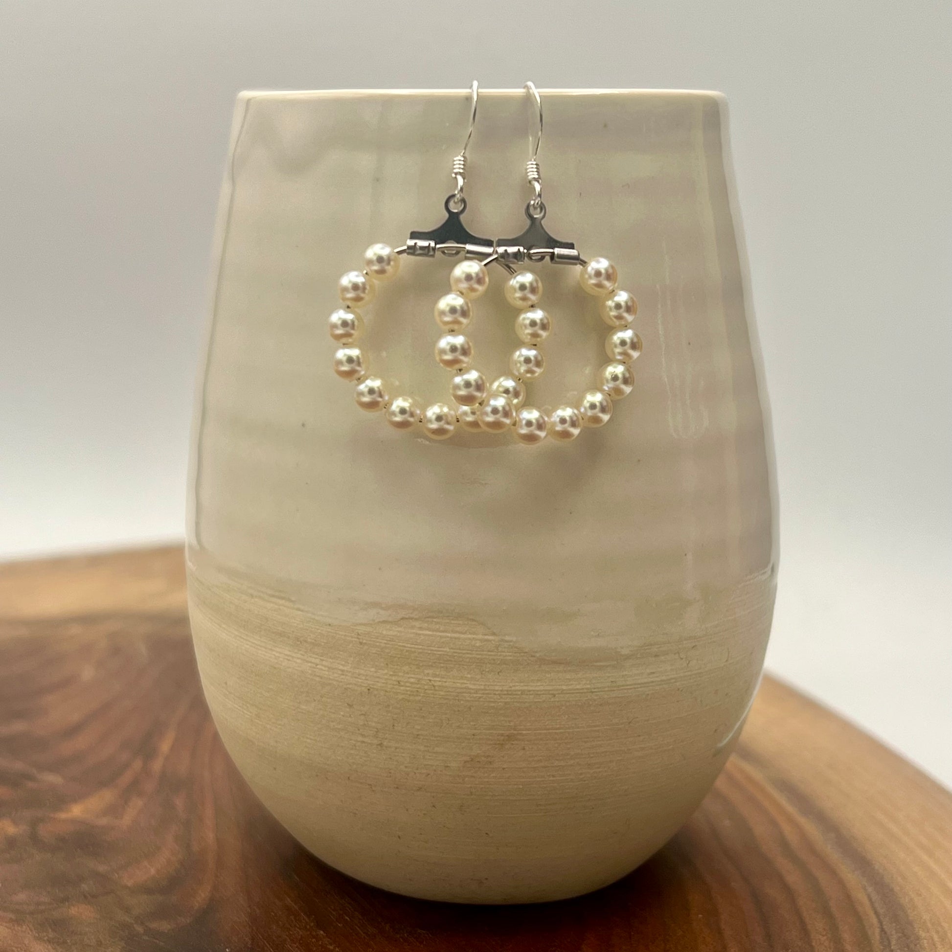 These are beautiful dangle earrings with Simulated Austrian Pearls and Sterling Silver. Pearls are associated with "Purity" and "Femininity". Sterling Silver lever backs were used to finish the earrings. The hoop is 20mm