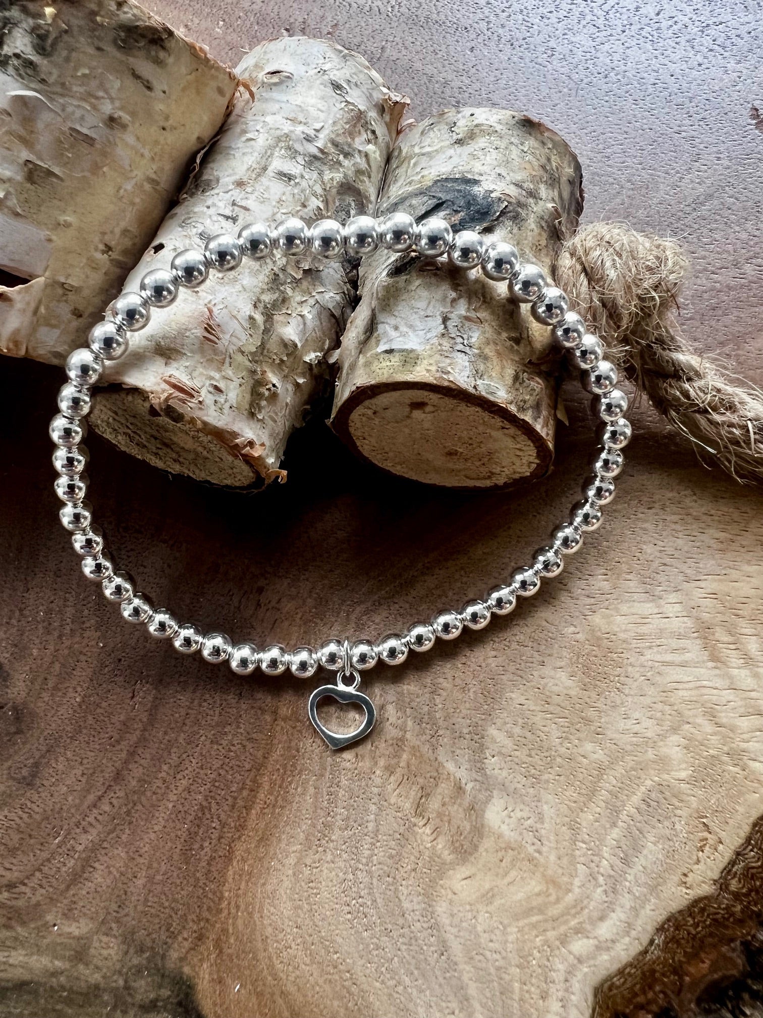 Beautiful Sterling Silver stretch bracelet made with 4mm beads and a sterling silver heart.